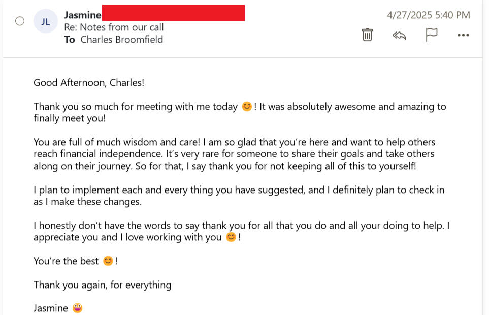 "Yes! It was very helpful to talk with someone close to my age about the subject of financial literacy as many others in our age group aren’t interested in talking about retirement and finance. Thank you Charles!"- Jon Lee